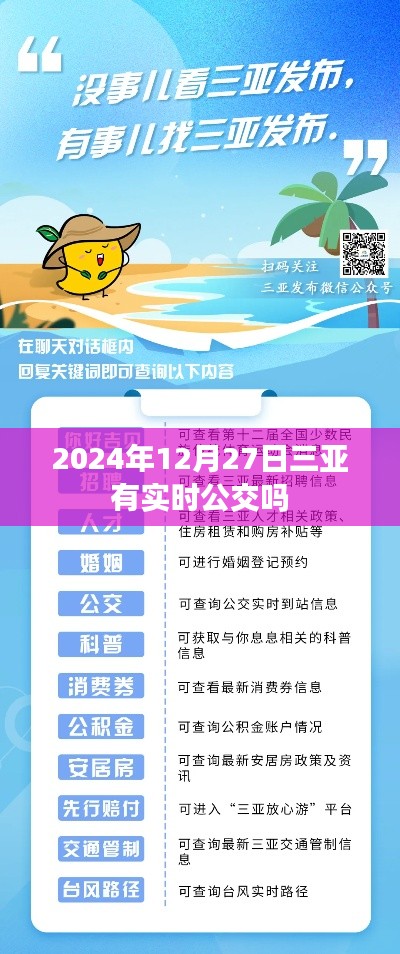隨著科技的進步和城市化進程的加快,實時公交查詢系統(tǒng)在現(xiàn)代城市生活中扮演著越來越重要的角色,對于旅行者而言,能夠?qū)崟r掌握公交信息,意味著出行更加便捷、高效,在即將到來的2024年12月27日,三亞這樣一個熱門的旅游勝地,會有實時公交查詢服務(wù)嗎?本文將圍繞這一問題展開探討。