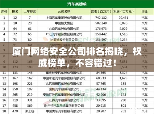 隨著信息技術的飛速發(fā)展,網(wǎng)絡安全問題日益凸顯,已成為各行各業(yè)關注的焦點,廈門,這座美麗的海濱城市,不僅是經(jīng)濟特區(qū),也是科技創(chuàng)新的高地,在網(wǎng)絡安全領域,廈門擁有眾多專業(yè)公司,它們致力于提供全方位的網(wǎng)絡安全解決方案,為企業(yè)的穩(wěn)健發(fā)展保駕護航,本文將為您介紹廈門網(wǎng)絡安全公司的排名,以便您更好地了解這些企業(yè)的實力與特色。